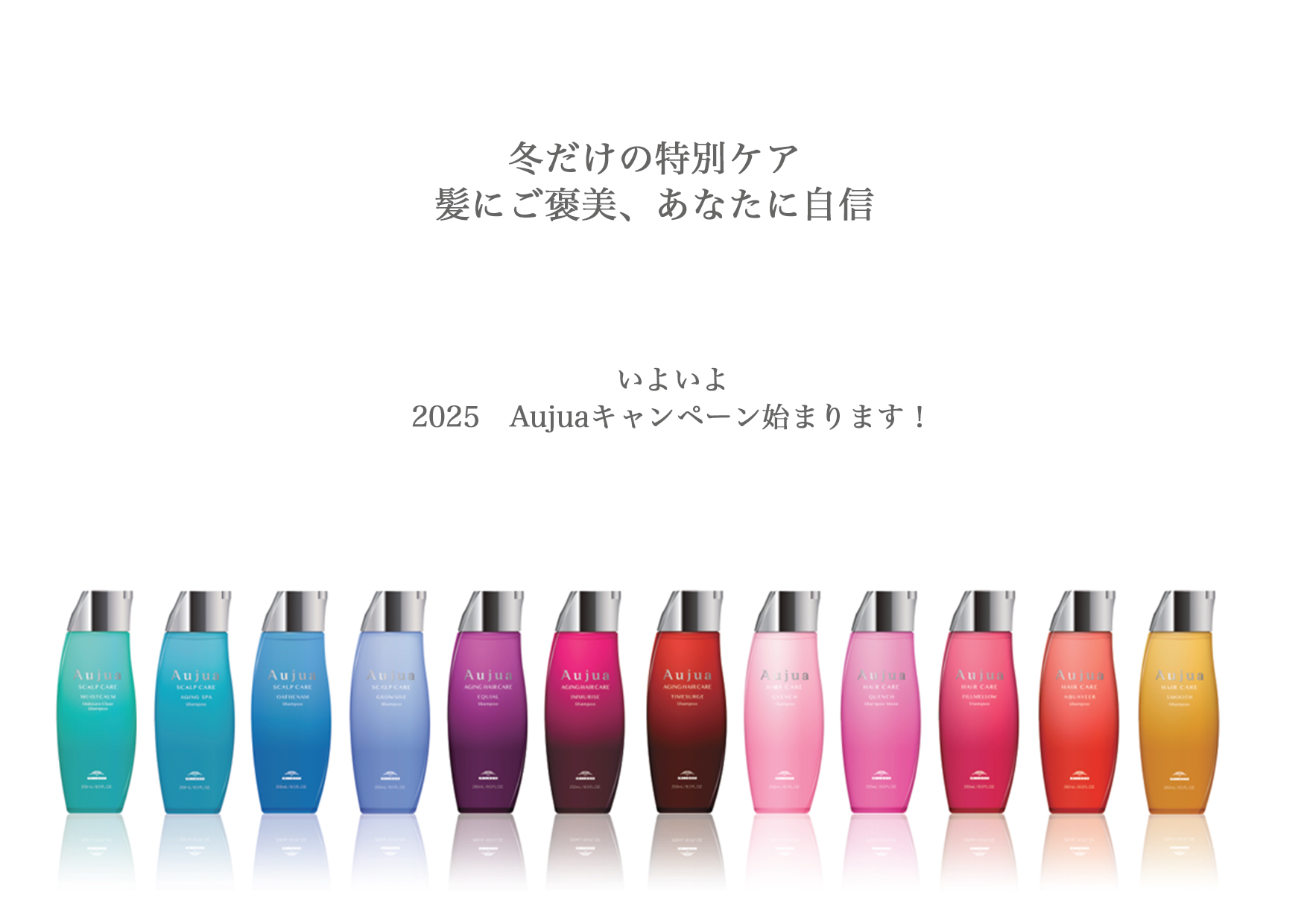 髪にご褒美、あなたに自信。AUJUA冬のキャンペーン先行予約受付開始します!熊本光の森武蔵ヶ丘美容室YAE/AUJUAのことならおまかせ/ お知らせ 2025.09.26 いよいよ毎年開催してます、AUJUAキャンペーン始まります!( /お問い合わせ プロフェッショナルブランドAUJUAがあなただけの髪質に合わせた特別なケアをお届けします。今だけの先行予約特典でワンランク上の美しい髪を体感してください。