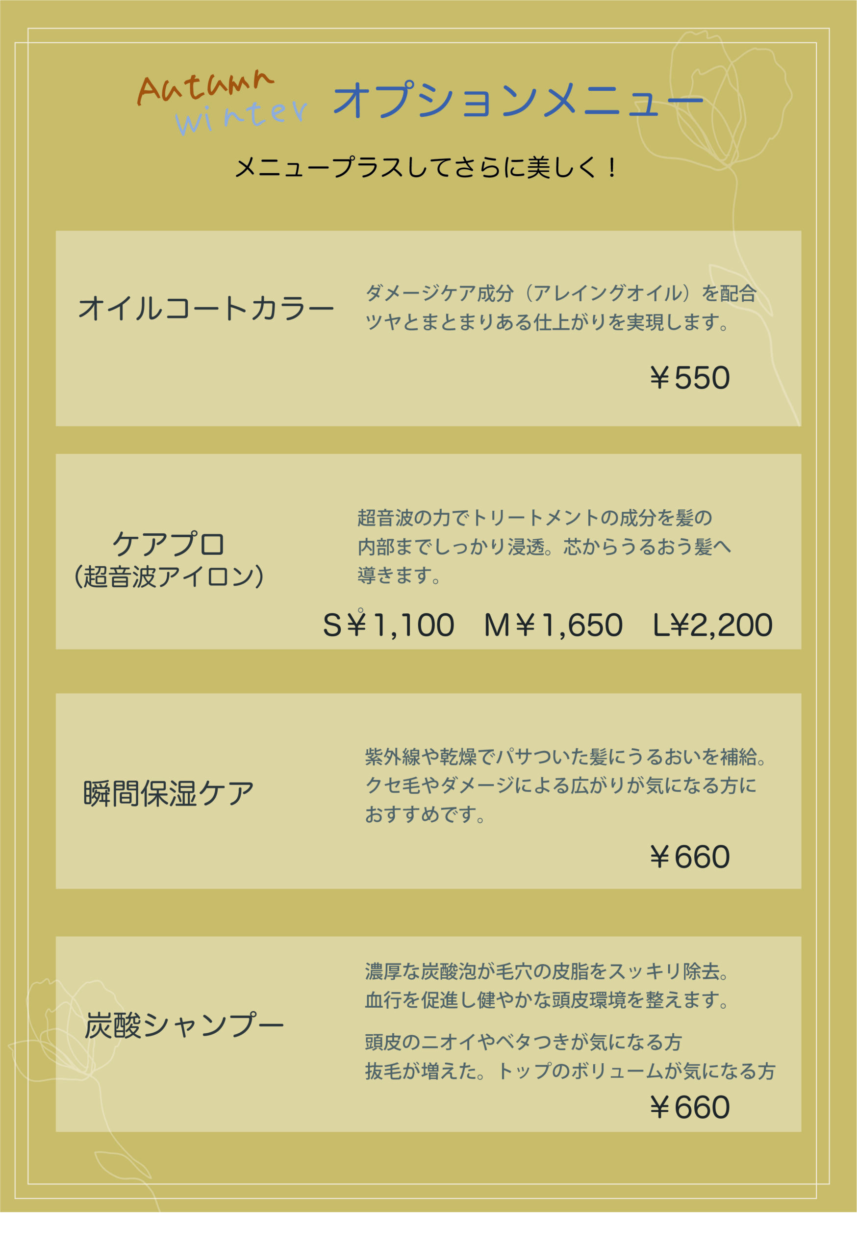 Autumn&Winter/季節のオプションメニュー熊本北区美容室YAE/光の森美容室YAE/ お知らせ 2025.10.24 季節の変わり目。髪と心をいたわる特別なメニューを揃えました。この季節だけのケアメニューで(自分らしさをもっと好きになれる秋冬をお過ごしください。